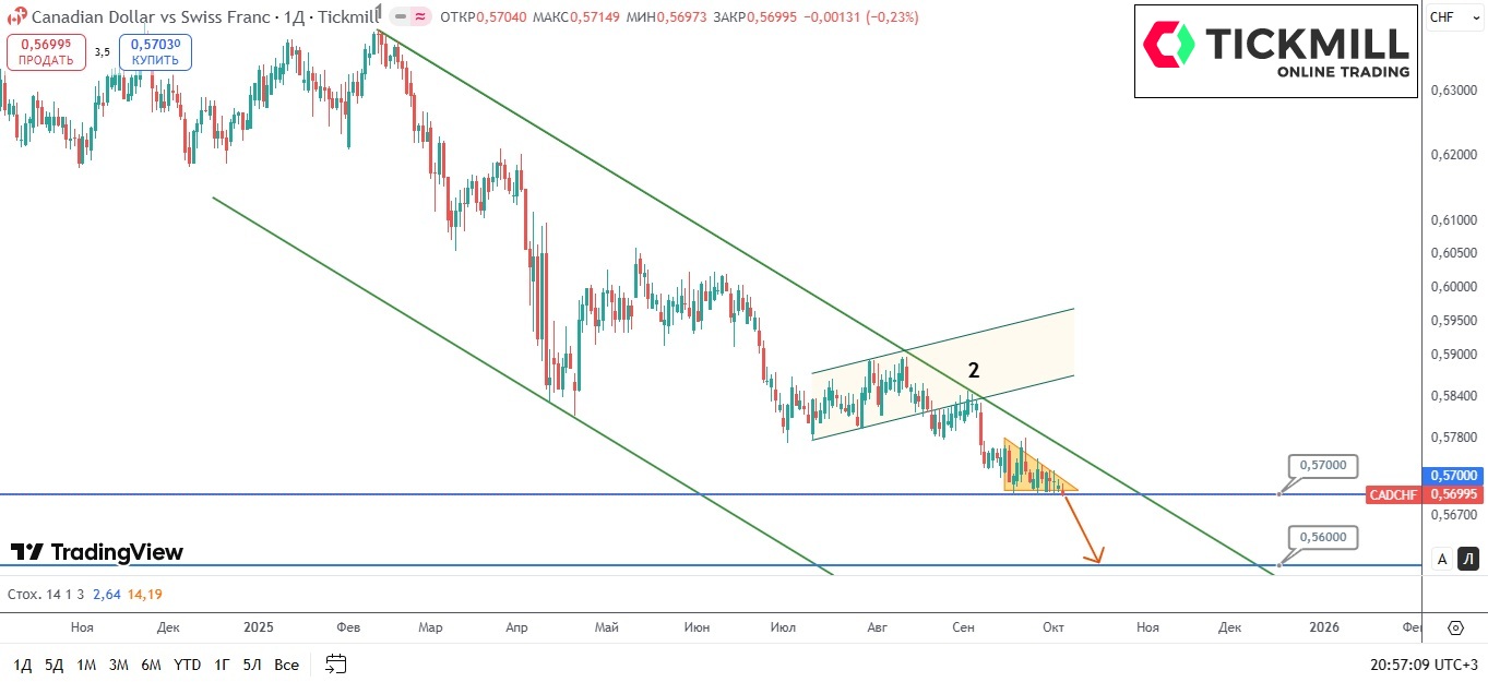 Медведи который день продолжают “прижимать” котировки CAD/CHF к уровню поддержки 0.5700, пытаясь прорвать последний тонкий оборонительный рубеж покупателей. Валютная пара который месяц остается в нисходящем канале, формируя в последние пару недель небольшой нисходящий треугольник, больше напоминающий вымпел. Силы у продавцов – грандиозные, поэтому и давление на горизонталь может быть аналогичным. В случае прорыва указанного выше уровня фокус рынка может сместиться на поддержку в районе 0.5700, а при более агрессивных продажах – и поход ниже. Но, не стоит исключать и фиксации прибыли на горизонтали 0.5700 – про это нам подскажет, как обычно, поведение и формирование свечных сигналов.